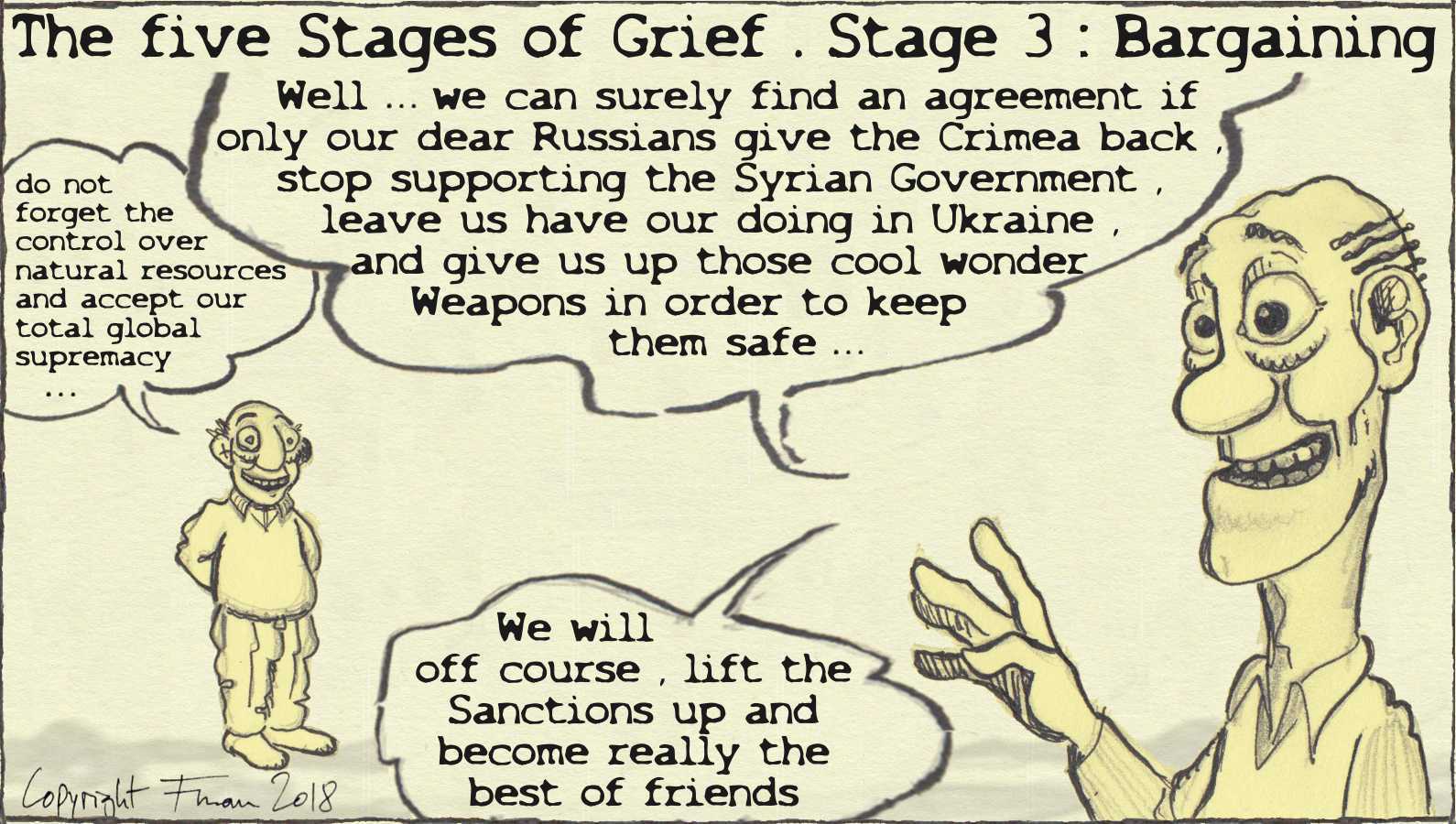 Známý komentátor Saker napsal v citovaném článku, že Západ je zbabělý, lže a chová se naprosto iracionálně. S tím nelze než souhlasit, což ukazuje vývoj v Sýrii a hysterie ohledně neexistující kauzy Skripala. Tak se podívejme na finální stav myšlení Západu, kterému odpovídá stav médií. Obojí je možné analyzovat podle modelu Kübler-Ross, což dělá Saker. Prožíváme terminální fázi Západu v jeho iracionalitě a popírání reality, což odpovídá psychologickému stavu příbuzných ve vztahu k umírajícímu rodinnému příslušníkovi. Západ nyní prochází prvním stadiem terminálních stavů bez rozumu, které jsou následující: popírání, zlost, vyjednávání, deprese a přijetí reality. Tak se podívejme na první stádium.