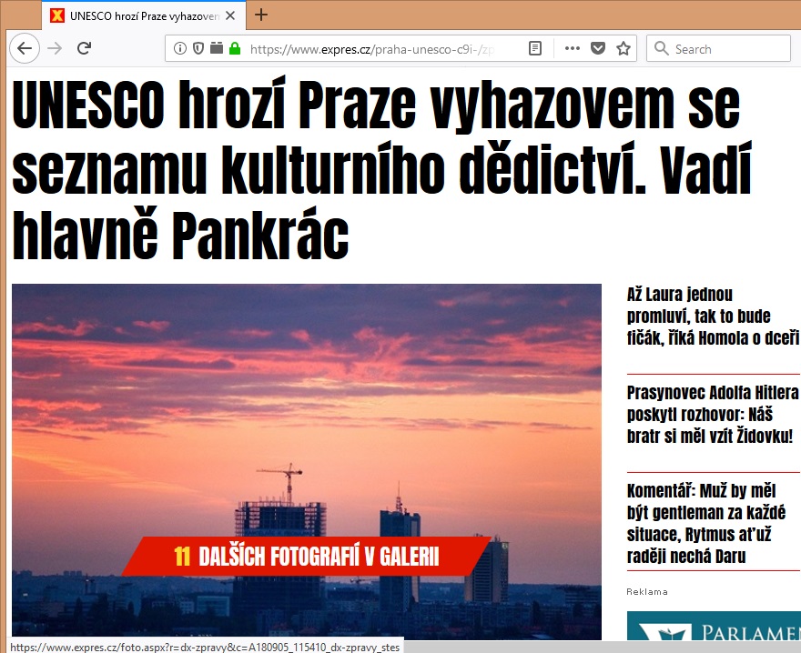 Jsem přesvědčen, že vzduch a voda by měly mít nejvyšší možnou ochranu, rozhodně vyšší, než je řada jiných věcí, specifikovaných ministerstvem kultury. Jsem rád, že stát, přes ministerstvo kultury, dbá o kulturní dědictví. Nevím kolik naše památková péče dostává peněz od UNESCO, jestli to vůbec není všechno z našich daní, ale poté, co USA přestala platit svých 22 procent jeho výdajů, dá se předpokládat všeobecné utažení opasku. To, že USA přestaly platit, je odplata za přijmutí Palestiny do UNESCO v roce 2011, „malý pokrok v mírovém procesu a velká ztráta pro UNESCO,“ řekl Klaus Hufner. Protože na palestinských hranicích střílí IDF ženy a děti jako králíky, tak nevidím pokrok, ba naopak přitvrzení za panování Trumpa. Když tedy bude důvod vyškrtnout Prahu, při utahování opasku k tomu určitě dojde.