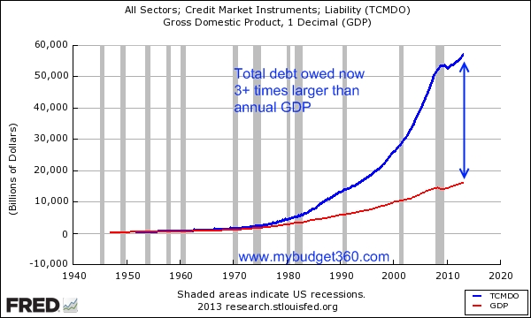 Stav kupní síly dolaru během jednoho století není radostný, neb vlastníme pouze 4 % jeho původní ceny. A dolar je potištěný papírek slibující cestu do ráje. Tak se podívejme, jak je to s jeho aktivy, tedy s výší dluhu versus HDP země, která tuto „ceninu“ kryje.