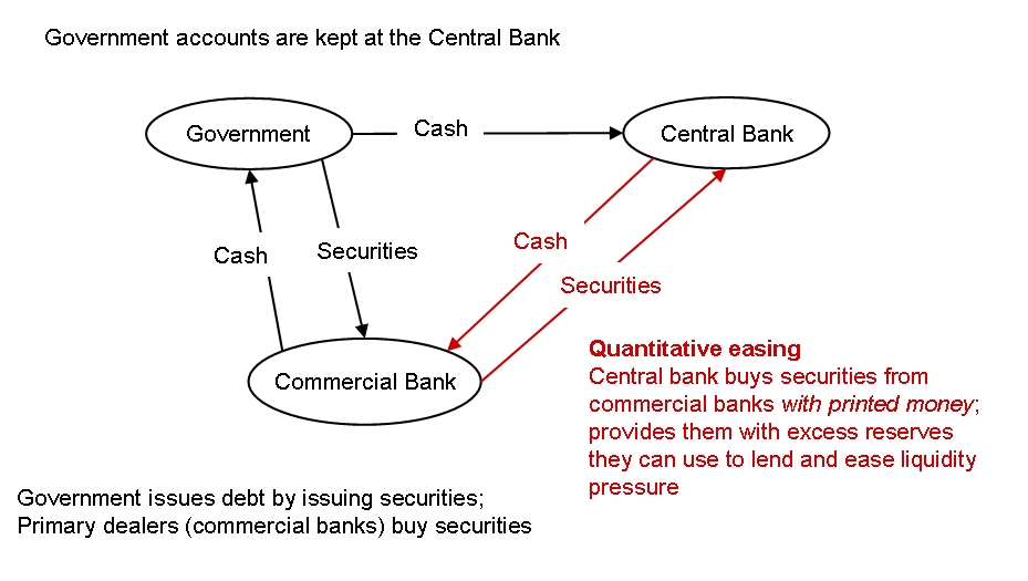 Bez problémů prošla první varianta, že totiž není z čeho brát. Jestliže ekonomika USA má 2,4 bil. USD importu a jen 1,4 bil. USD exportu, pak jakékoliv zvýšení základní úrokové sazby nad inflaci znamená, že se úroky nemají z čeho platit. A chudí Američané by okamžitě zkrachovali a skončili by na ulici jako za hypotéční krize. Země kromě dluhu nemá nic jiného. OK, to by šlo. Ale námitka zní, že přece tak do země povalí kromě petrodolarů i ty dolarové šipečky z Asie a z EU a přibude dolárků na kontě dluhy oplývajícího FEDu. Ale to by celý kolotoč jen zhoršilo, protože za dolar není co nabídnout. Takže základní otázka zní: Proč musí FED tisknout dolary zadarmo a dávat je nikoliv lidem na ulici, ale jen vybraným bankám? Tisk dolaru zadarmo se jmenuje „kvantitativní uvolňování“ (Quantitative Easing, v grafech QE). Dobrý článek česky máte ZDE a jinak si klikněte na heslo v našich článcích. Prostě a jednoduše, zadlužený FED bankám dal ničím nekryté peníze z rotačky a přitom převzal jejich hloupé dluhy a riskantní úvěry. Viz tento graf.