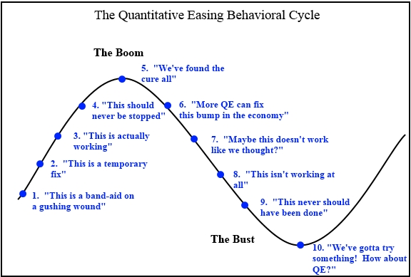 Dluhových dolarů je dvanáctkrát víc než činí HDP zeměkoule a nedají se odlišit od normálních peněz. To si bankéři zařídili zrušením tzv. Glass-Steagall Act vydaného jako zákon po bankovním krachu v roce 1932. Paranoia zvaná „QE“ má klasický cyklický průběh jako u každého šílenství a vypadá takto.