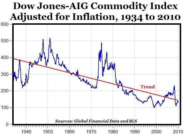 Takže FED a banky mají peněz habaděj, ale normálním lidem peníze exponenciálně nerostou jako bankám. To je ta modrá dole. A co se s těmito penězi v bloku M3 a hlavně QE děje? Abychom to vysvětlili, představte si, že nejste dcera Kellnera. To není tak těžké, že ano. A proto jako normální člověk nekupujete závodní koně za stamiliony. Takže těchto koní je málo, je po nich malá poptávka a cena této komodity nemůže růst do nebe. To je normální světový trh surovin, výroby, prodeje a našich platů. Podívejme se tedy na dlouhodobý vývoj surovin očištěný o inflaci.
