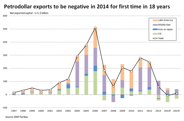 Arabové a další se chovali přesně jako jejich západní kolonizátoři. Zvýšili si standard (zelená), dělníkům nepřidali (žlutá) a zbylé peníze si uložili u bank hlavně v USA (červená). Reexport dolarů vypadal takto, viz aktiva ropných zemí uložených v zahraničí.