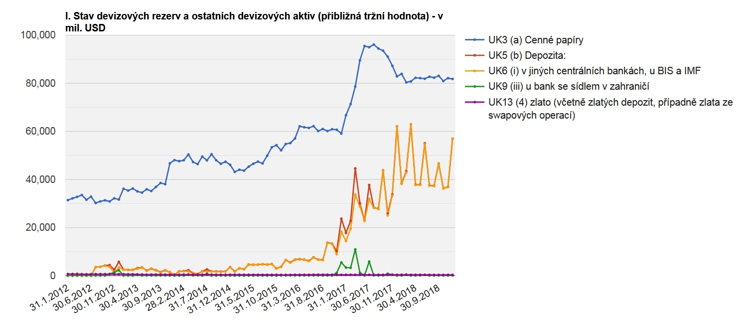 Takže všechno jsme vrazili do dluhových papírů cizích bank, výborně. A do zlata jsme nevrazili ani korunu, viz parametr UK 13. Pro jistotu jsem vám ho vytáhl zvlášť.