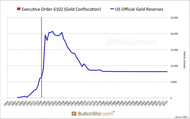 Modrá ukazuje ekvivalent burzovní hodnoty dolaru a zlata za 20 let vzhledem ke kolísání ceny. Pochopitelně že šla cena zlata dolů, když se USA zbavila zlatého standardu ve 30. letech a v roce 1973 navázala dolar na ropu. Z grafu je jasné, že poptávka po zlatě nutně klesla, protože centrální banky pracovaly po vzoru dolaru. Vývoj zlata jako bankovní záruky ukazuje tento graf.