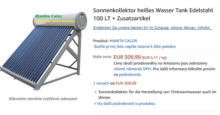 Nelíbí se mi, že vaříme vodu nad atomovou bombou, spalujeme uhlí, kterému jsme bez patřičné úcty říkali černé zlato a můj učitel organické chemie v šedesátých letech minulého století naříkal nad barbarstvím pálit tak cennou surovinu. Jsem přesvědčen, že bez okamžité systémové změny ztratíme Zemi a sami sebe. A protože nedosáhnu na systémovou změnu, pokusil jsem se sám o udržení mírného ohřevu Země v mezích zákona a objednal jsem si solární panel na ohřev vody od firmy Amazon.