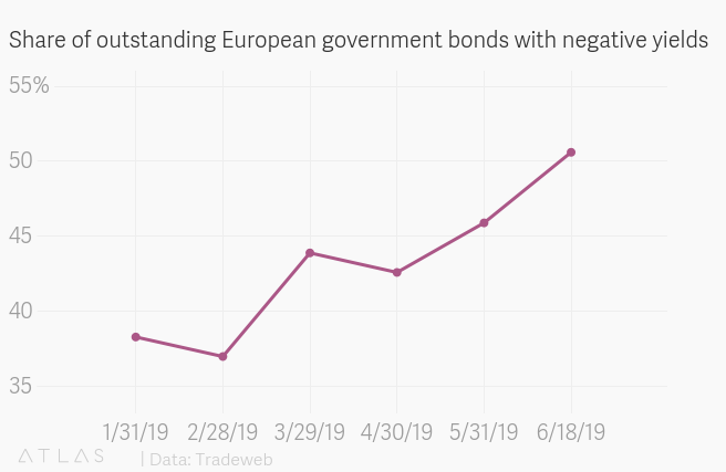Podívejme se blíže na systém totální zlodějny jednoho banksterského promile, který běží přes záporný úrok. V současné době je ve světě podle Deutsche Bank asi 15 biliónu dolarů cenných papírů a obligací všeho druhu, které už mají záporný úrok. To je, prosím, v současné době celkem 25 % světového finančního trhu. Od října 2018 se toto číslo ztrojnásobilo na dnešní stav. Banksteři v centrálních bankách nám zničili peníze proto, aby si je mohli sami tisknout formou ničím nekrytých dluhopisů. Tyto šmejdy prodávají jménem států, tedy našim jménem, a tím nahrazují normální státní měnu krytou alespoň naší prací. Podívejte se na tempo růstu negativních dluhopisů v rámci EU za posledního půl roku.