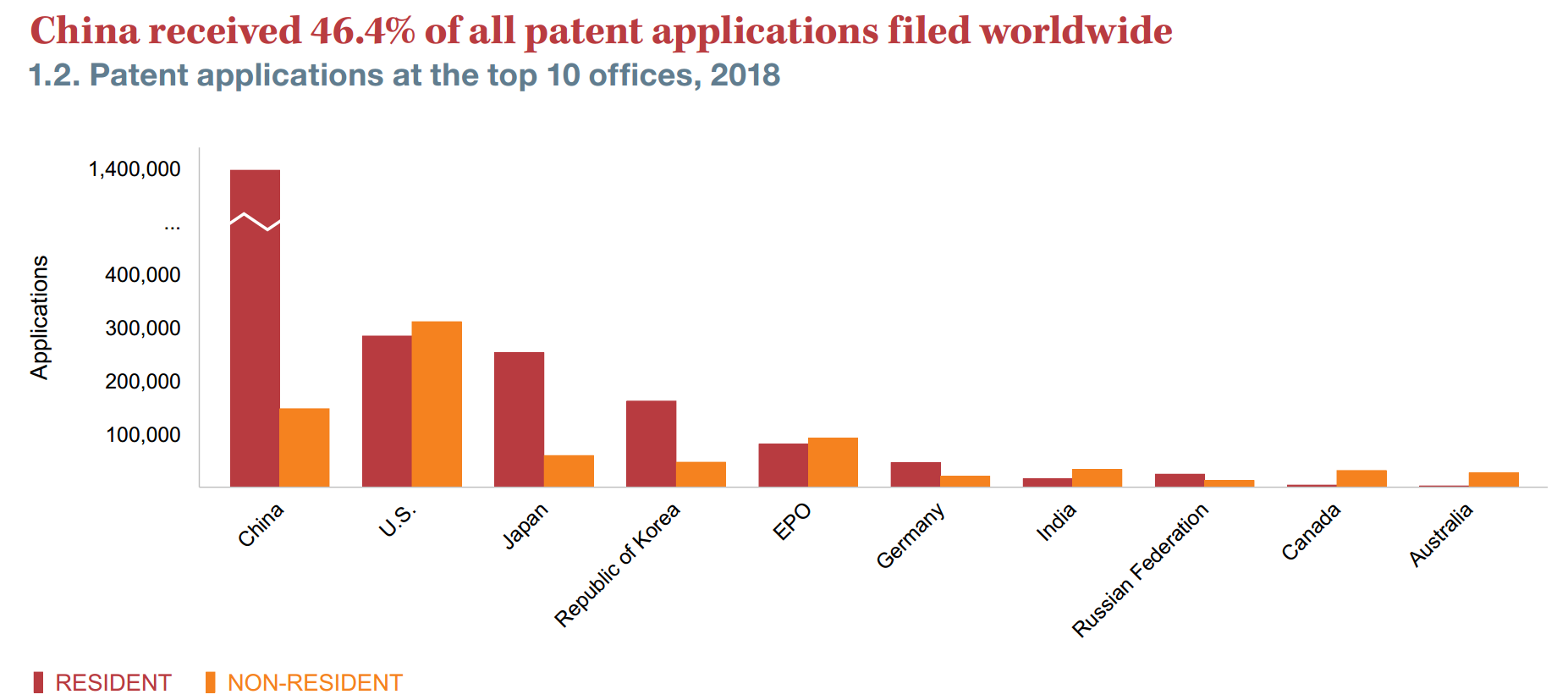 Spojené státy mezitím zahájily studenou válku nejen proti Rusku, ale i proti Číně. Tak zvažme, jaké má šance. Vojenské vyhlídky jsou zatím nulové, protože strategické scénáře Třetí světové války ukazují, že spojenectví Číny a Ruska spolehlivě vyhrává. Už 2. světová válka se rozhodovala skrze techniku, a ta Třetí nebude výjimkou. Podívejme se, jak to vypadaná na poli vědy, výzkumu a patentů mezi Čínou a USA. Cituji z hlavní ročenky World Intellectual Property Indicators 2019. Tak se podívejme, kdo za rok 2018 podal nejvíce patentů.