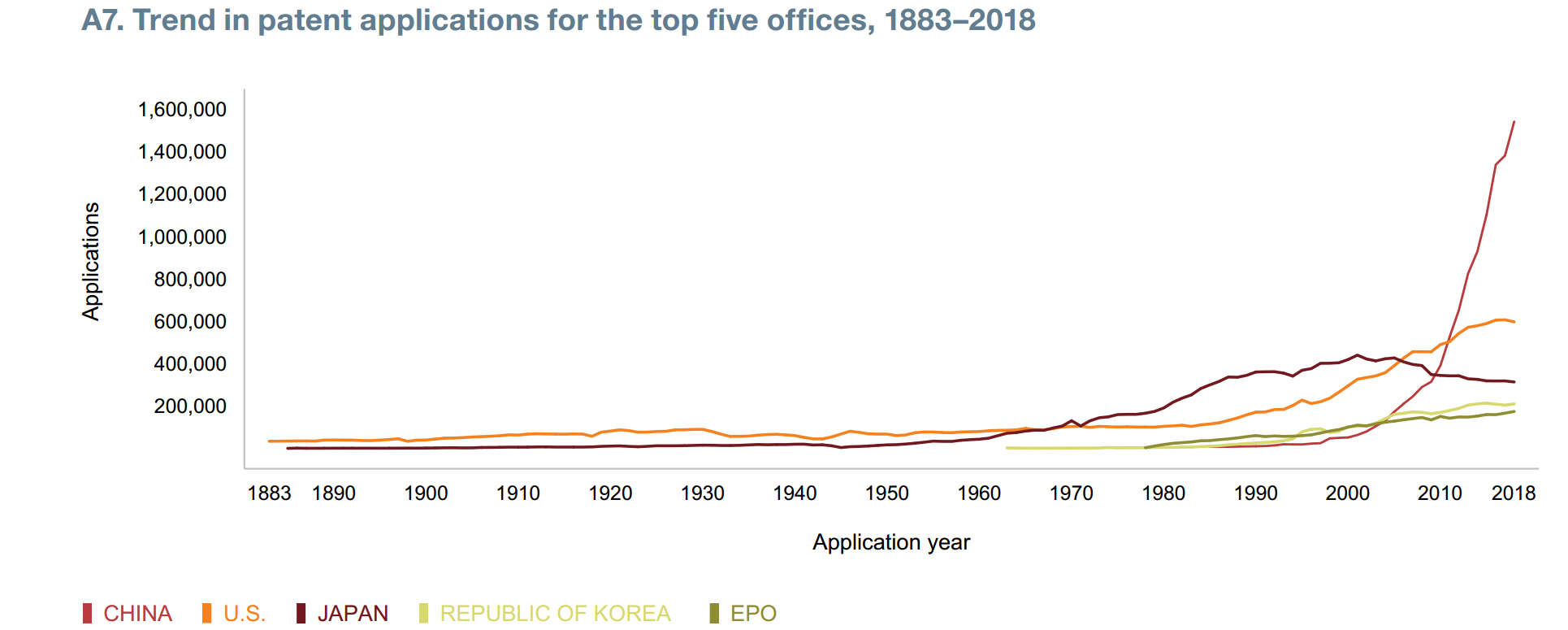 Jak sami vidíte, čínské patenty jsou produkovány a podávány hlavně doma, cizích je pouze 19.9 %. Pro USA je to opačně. Pro dolarové impérium dělají mozky v koloniích a cizinci patenty přihlašují jinde, i když jsou vlastnictvím amerických firem (53,1 %). Na závěr se podívejte na celkový trend v patentech.