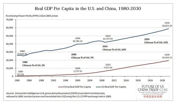 Stejný graf, ale mnohem horší pro Čínu, ukazuje podíl HDP na obyvatele pro USA a miliardovou Čínu. Pokud přepočítáme PPP na spekulativně manipulované dolary, tak jsou na tom USA zatím celkem dobře. Ale přežití dolaru je nejisté a je vázané na mocenské postavení Západu.