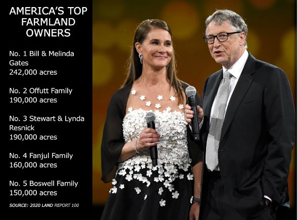 Podle Forbese není známo, co Gates se zemědělskou půdou udělá, a společnost Cascade Investments odmítla tento problém komentovat. Pokud jde o jednotlivé vlastníky půdy jako takové, Gates je stále daleko za mediálním magnátem Johnem C. Malonem, který je na prvním místě s 2,2 miliony akrů rančů a lesů a zakladatelem CNN Tedem Turnerem, který vlastní 2 miliony akrů půdy na ranči. Miliardoví filantropové a technokraté získávají půdu čím dál tím rychleji. Když zakladatel a globalista Světového ekonomického fóra Klaus Schwab ve svých knihách objasňuje, že „4. průmyslová revoluce“ nebo „Velký reset“ povedou ke zrušení soukromého vlastnictví, zdá se, že nakonec veškerou produkci potravin bude mít pod palcem jeden člověk a jeho korporace se bude jmenovat nějak jako Všem do syta. Kouzlo této korporace bude v tom, že bude mít neomezenou moc nad tím, kdo zemře hlady a kdo dostane najíst. A to mluvíme nejen o jednotlivcích, ale i regionech či kontinentech. O tom, že do toho bude spadat i "poloostrov za Ruskem" (tedy Evropa), není pochyb. Bill zastává metodu intenzivního hospodářství a možná si na kousku pole postaví nějakou fabriku na vakcíny, ale určitě nenechá půdu na skladování neprodejných aut a letadel. Jistě by nenechal naší ornou půdu takzvaným silným hráčům skladovacích prostor, co na moravské černozemi chtějí stavět nízkopodlažní sklady s asfaltovou střechou a dešťovku sváděnou rovnou do kanalizace.