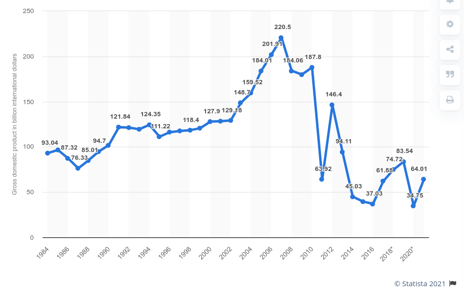 A tady vývoj HDP na hlavu (index PPP). Ale země je vylidněná, hlavní příjem je z plundrované ropy a pašování uprchlíků z celého světa do EU. A celkem slušný příjem okolo 1500 dolarů za měsíc mají všichni místní a zahraniční žoldnéři a teroristé, kteří zde bojují. Tak se nedivte tomu zajímavému skoku v posledních letech.