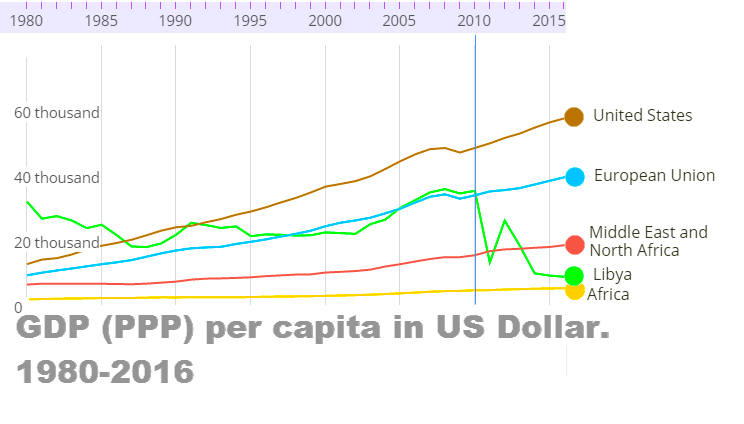 Tady jsou grafy, nebudu je komentovat, stačí se podívat na vývoj po roce 2011-15, kdy v zemi dobyté NATO a teroristy zavládl onen "chaos", o kterém psala i citovaná ČT. Začněme srovnání s jinými státy a ekonomikami, tj. USA, EU, Afrika.