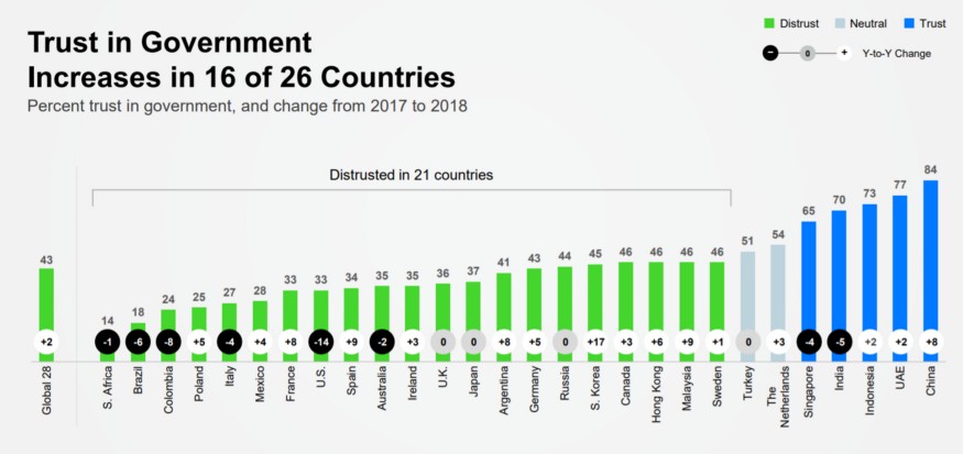 Čína má bohužel jen oficiální vládní statistiky, ale stačí se podívat na systém spokojenosti s vládou a porovnat ji s celosvětovým průměrem.
