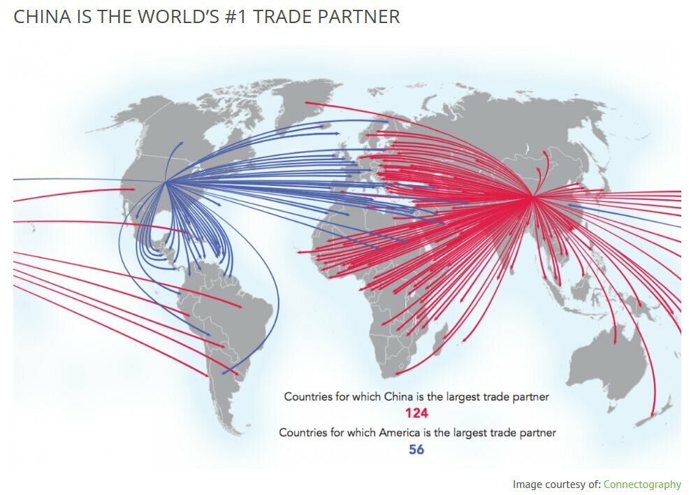Komunistická Čína je náš nadekretovaný nepřítel, protože má nejúspěšnější kapitalistický systém všech dob, srovnáme-li rychlost industrializace, pokrok vědy a technologií. Podívejte se na graf zemí, které mají Čínu jako hlavního obchodního partnera ve srovnání s USA.
