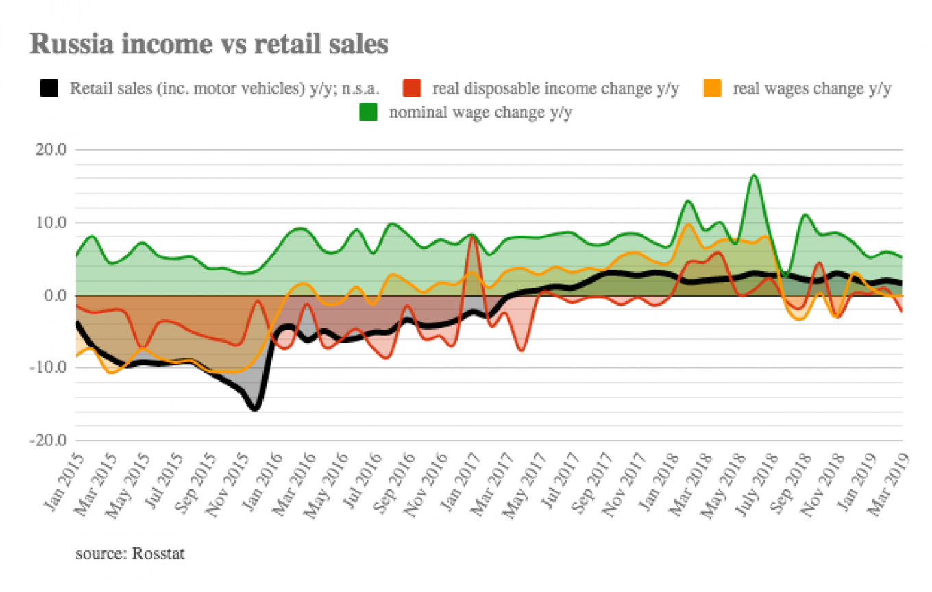 Černá ukazuje růst maloobchodních cen, červená pokles reálného příjmu rodin, oranžová pokles reálných mezd a zelená pomalý růst nominálních mezd, např. nyní zvýšené minimální mzdy ve státním sektoru. Tomu odpovídá rostoucí zadlužení ruských domácností.