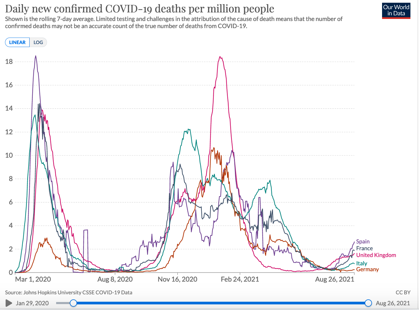Začněme Afghánistánem, kde máme dvě vlny "boje proti terorismu" inscenované Sovětským svazem a pak Spojenými státy. Obyvatelé tohoto státu spí s kalašnikovem v posteli a nemají rádi, když jim Britové, Rusové nebo Američané vykládají, jak mají žít svůj vlastní život. Takže první vlnu odporu financovala CIA tím, že vyzbrojila nějakého Saúda jménem Bin Ládin, aby vytvořil al-Kájdu a prováděl partyzánskou válku proti Sovětům. První vlna boje proti teroru skončila odchodem Sovětů a epidemickou vládou Talibánu. Druhou vlnu vytvořila už bohužel i za mé daně stejná CIA tím, že zahájila další intervenci a ve druhé vlně proti Talibánu financovala tento odboj za peníze CIA stejná parta demokratů, kterou financoval Pákistán jako prostředník. Jak dopadla druhá vlna epidemického boje proti terorismu, o tom jsme psali nedávno (Postupný rozpad impéria: Od porážky v Saigonu k debaklu v Kábulu). A nyní ke dvěma vlnám kovidu podle tohoto grafu.