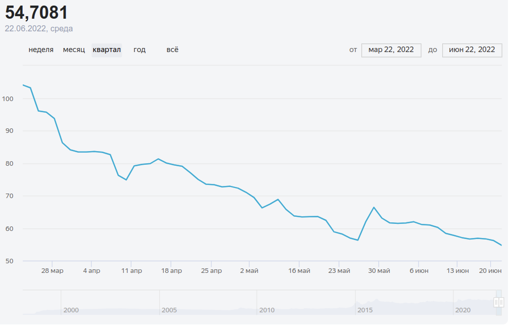 Takže křivka místo výstřelu strmě nahoru začala strmě klesat. Sorry jako, hoši z ECB, Fedu a Světové banky. Druhý graf ukazuje celkový vývoj kurzu rubl/dolar za dlouhé období, které je důležité okomentovat. Pád dolaru vůči rublu máte až na konci, kdy začala ostrá válka na Ukrajině.