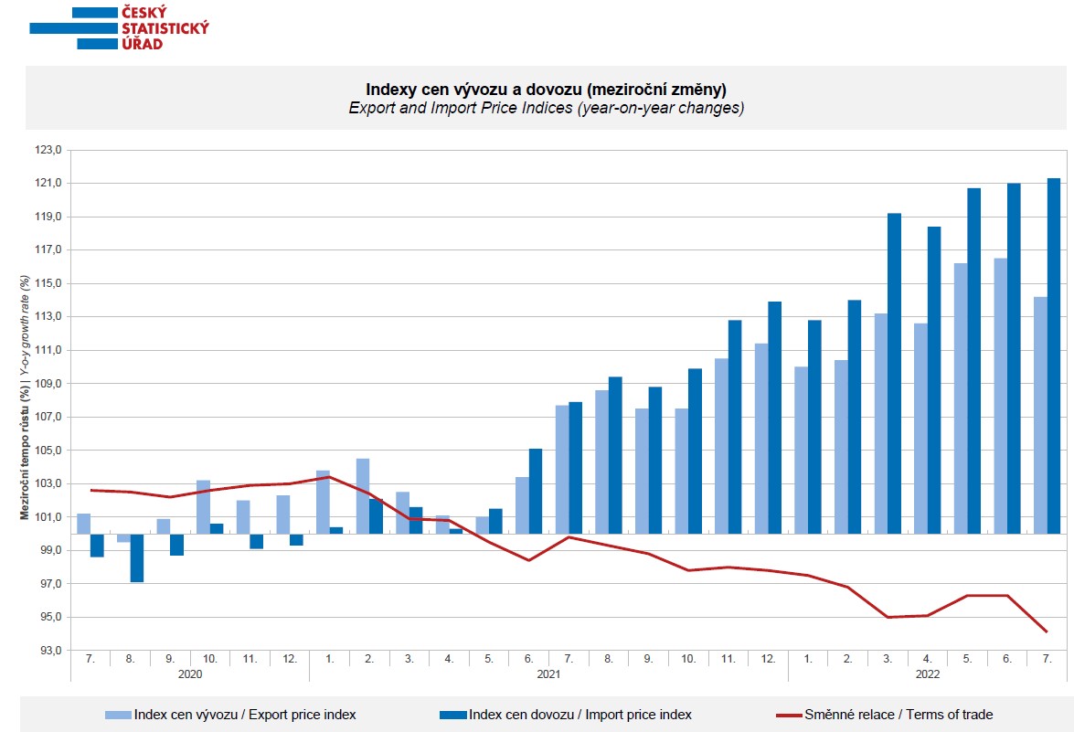 Podívejme se na pár grafů, abychom pochopili vážnost současné situace. Začněme Českou republikou a grafem indexů cen vývozu a dovozu podle meziročních změn.
