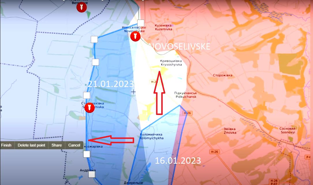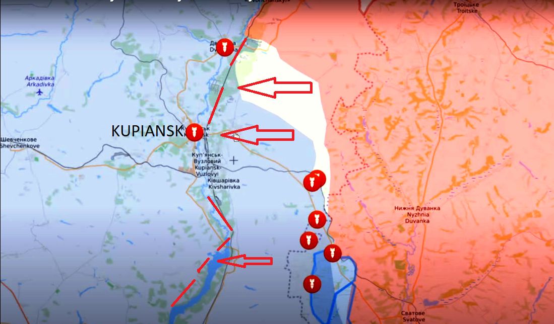 A nyní zpět k Soledaru a Bachmutu. Situace v Bachmutu je pro Ukrajince každým dnem kritičtější. Ale i kdyby padl Bachmut, neznamená to, že ruská armáda dosáhla svého cíle zimní ofenzívy. Tou je osvobození celé Doněcké oblasti, která byla prohlášena za nedílnou součást Ruska. Nyní se jedná především o města Kramatorsk a Slavjansk. Pokud budou Rusové pokračovat v ofenzivě od Soledaru a Bachmutu směrem na Kramatorsk a Slavjansk, mohou se Ukrajinci na této frontě udržet až do dubna. Na tomto směru je mnoho lokalit, které byly již dříve opevněny. A tím se vracíme k průlomu, který Rusové provedli u Svjatova a který se do konce ledna může projevit jako návrat ke staré frontové linii z loňského léta. Jakmile ruská vojska znovu obsadí Izjum a Barvinovo, fronta v Donbasu se zhroutí. Slavjansk a Kramatorsk budou Rusy obsazeny obchvatem od Bachmutu a Barvinova (mapa 5).