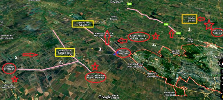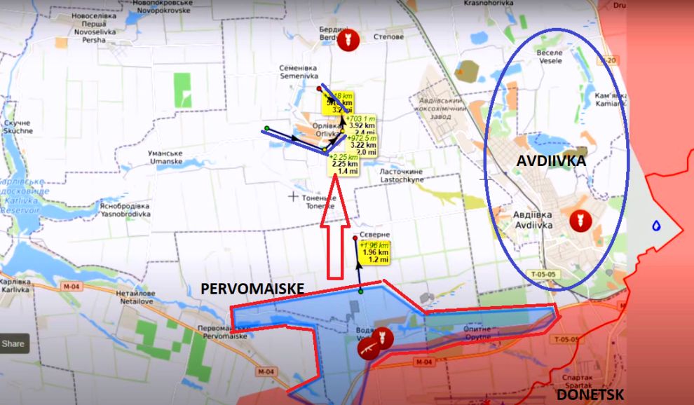 Avdijevka je město na severozápadním předměstí Doněcku. Rusové se ji neúspěšně pokusili dobýt frontálními útoky. Včera se Rusům podařilo zaútočit jižně od Avdijivky a obsadit vesnici Pervomajskoje. Odtud se přesunou na sever, zaútočí na opevnění Semenivky a obklíčí město Avdijevka (mapa 2).