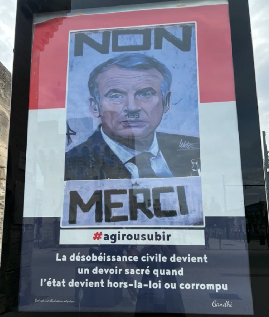 Nikomu ze znalců fašistické propagandy neušlo, co Le Monde udělal s Macronem, alias rotschildovskou předělávkou německých bankéřů ze 30. let. A nyní se posuneme o 5 let dopředu, kdy Macron už musí otevřeně potlačovat lidová hnutí ve Francii. Nejprve hnutí Žlutých vest a nyní celonárodní povstání proti jeho důchodové reformě. Takže není divu, že někdo udělal totéž, co Le Monde, ale jaksi na ruby. Lid republikánský udělal z Macrona dalšího Hitlera, na velmi vkusný a velmi výrazný způsob. Podívejte se na video, reklamy byly vyvěšeny v Avignonu minulý týden, od 17.-18. května 2023 (originál ZDE).