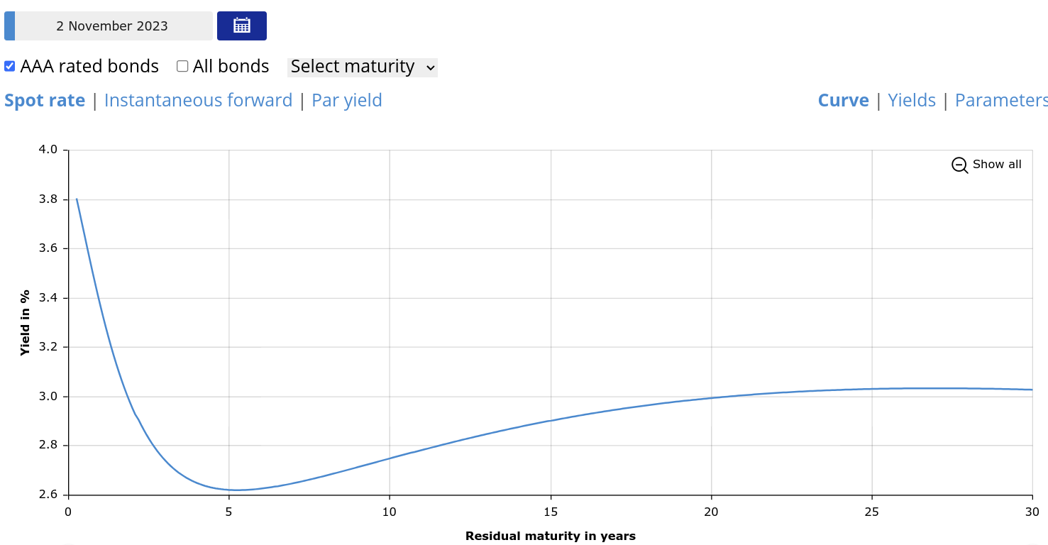 Jak sami vidíte bilance je absolutně nevyvážená, protože jih EU nevyráběl a měl trvalé dluhy vůči severu eurozóny. A jih navíc pumpoval prachy na sever, protože tam více vydělávaly. ECB následovala politiku Fedu a od roku 2015 spustila rotačky na euro v rámci tzv. asset purchase programme, neboli kvantitativního uvolňování. Úroky z ECB pro banky šly prakticky na nulu, krachující banky na jihu EU si půjčovaly u ECB jako divé málem za nulu a vydělávaly na úrocích. Na dluhové pohledávky každý kašlal, protože Draghi a spol. je vykoupili za cenu znehodnocení eura a našich celoživotních úspor. Takto vypadá ke 2. 11. 2023 znehodnocení bankovních dluhopisů EU.