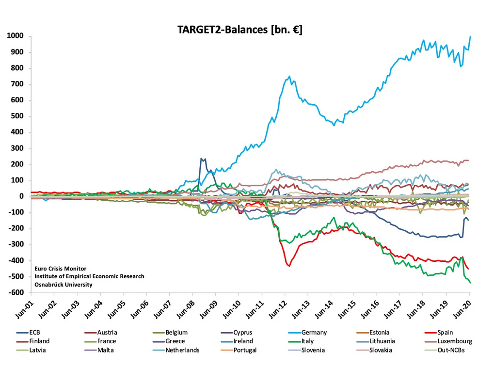 Takže začneme klíčovým ukazatelem, což není notoricky známý skok v inflaci, ale peněžní toky všech zemí EU sledované v rámci tzv. „Target 2“. Jednoduše: pošlete 90 korun na účet Německa a to vám musí do vyrovnané bilance (100) poslat 110 korun. Takže v saldu jste vy +20 drobných proti Německu, které má vůči vám dluh -20 korun. Tím je dlouhodobá bilance v rámci Target 2 vyrovnaná. Příklad: eura, která byla původně vydána v Itálii, skončí v Německu. Pak má německá centrální banka v rámci Target 2 mínus a aktivum zůstává u italské centrální banky. Němci pak musí přidat vyrovnávací položku, aby dorovnali ta eura na hypotetických 100 korun, což je bilance rámci Target 2. Prostě a jednoduše, Německo dluží Itálii prachy, a ty ji dá ve formě zboží. Tento ukazatel je klíčový pro bankovní a zbožní operace mezi EU-státy a do roku 2020 měl tento průběh.