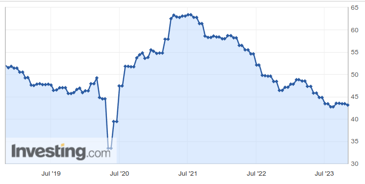 Sami vidíte, že propad výroby v rámci EU se netýká jen posledního roku, ale jde o trvalý jev. Pro koloniální montovny Říše na východních územích to jistě není dobrá zpráva. A nyní německý PMI za 5 let.