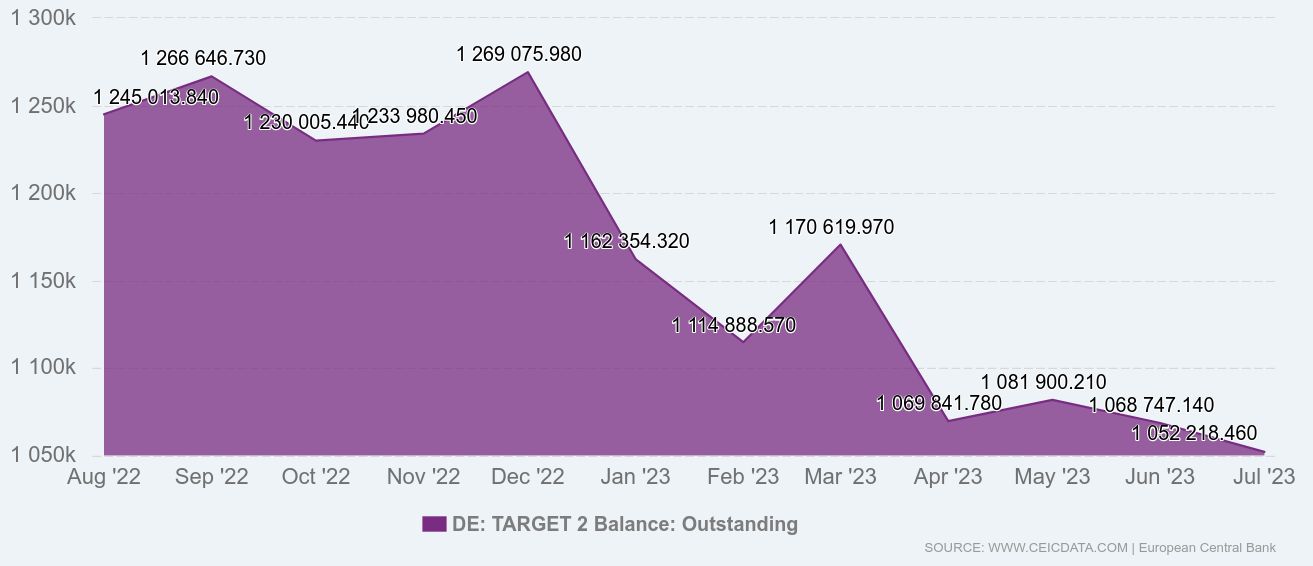 Takže zadlužené země jihu EU si vůbec nemohou dovolit drahé německé euro. A navíc se zastavil laciný euro-herák v podobě výkupu dluhů. To jde na skrytý účet daný znehodnocováním eura pro nás, obyčejné ovčany. Rotačky ECB a Fedu se zastavily, protože místo toho jedou proxy-války vedené Západem. Ten finanční šrot už nemá kdo kupovat, volné zdroje nejsou. Dluhový boom skončil a jižní státy mají dvakrát vyšší úrokové míry než bohatý zbytek EU. A nyní se podívejme na bilanci Target 2 v poslední době vzhledem k námi sledovanému Německu za poslední rok 2022-23.