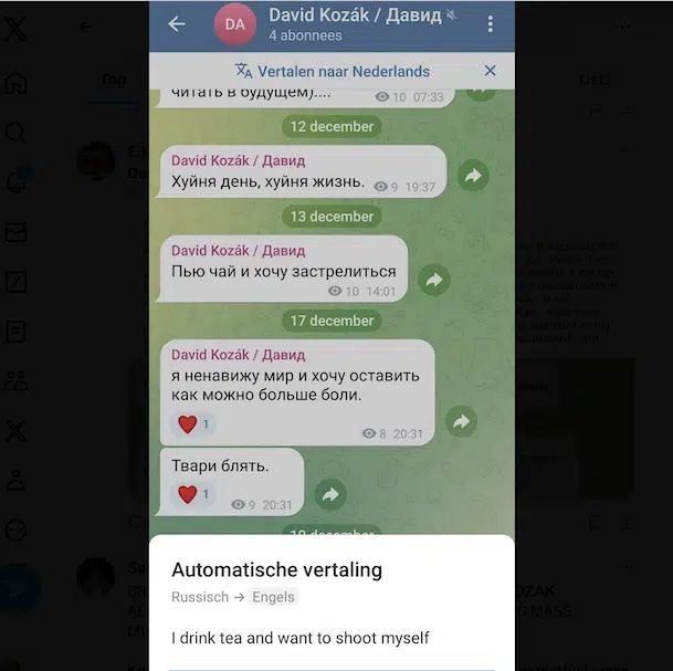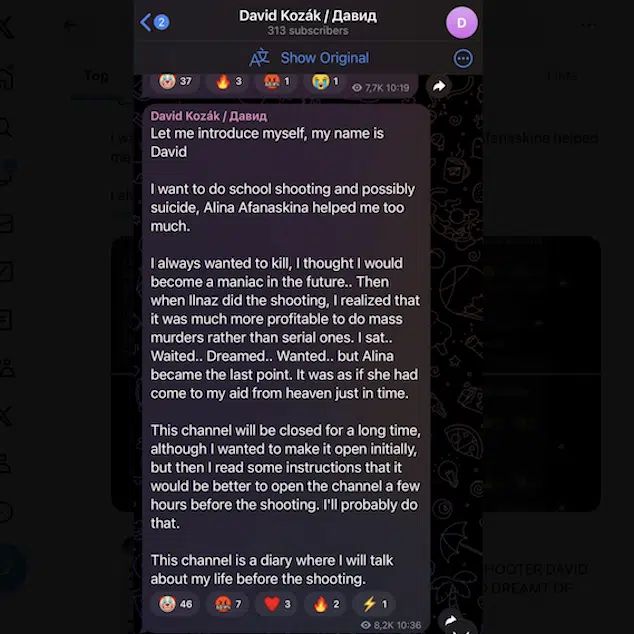 Pokud má pravdu web Justice Report, tak domnělý střelec David K. měl od 7. prosince 2023 vyvěšený post na kanálu Telegram, ze kterého je zcela zřejmé, že se připravuje na střelbu. Jeho inspirace, Alina Afanaskina, byla 14-letá školačka v ruském městě Brjansk, která 7. prosince (!) 2023 zabila dva spolužáky brokovnicí, kterou propašovala do školního gymnázia. Střelec zmínil v telegramovém příspěvku také 19letého Ilnaze Galjavjeva (19 let), který během teroristického útoku v Kazani v květnu 2021 střílel v jeho škole. Zde došlo k zabití devíti lidí, včetně jeho studentů 8. ročníku a dvou učitelů. Zraněno bylo 23 dalších osob. Jeho motiv byl stejný jako u našeho střelce na FF UK, tedy jasně deklarovaná nenávist k lidem. Podívejme se na poselství šíleného střelce z FF UK, tedy pokud se prokáže, že tento rusky psaný diář na Telegramu je opravdu od něj.