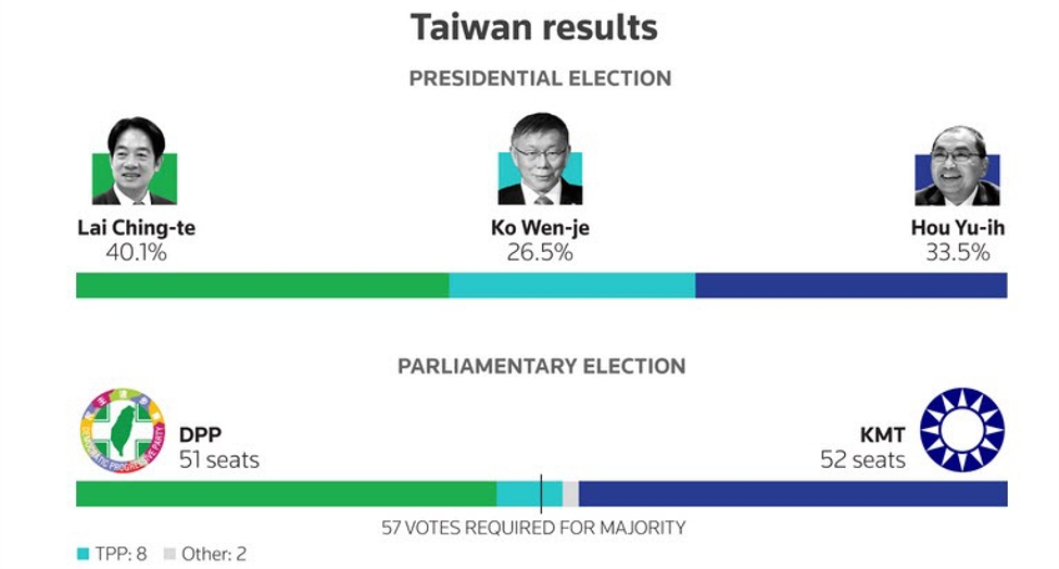 Nejprve se podívejme na přehledné výsledky prezidentských a parlamentních voleb na Tchaj-wanu (14. leden 2024), viz tento obrázek.