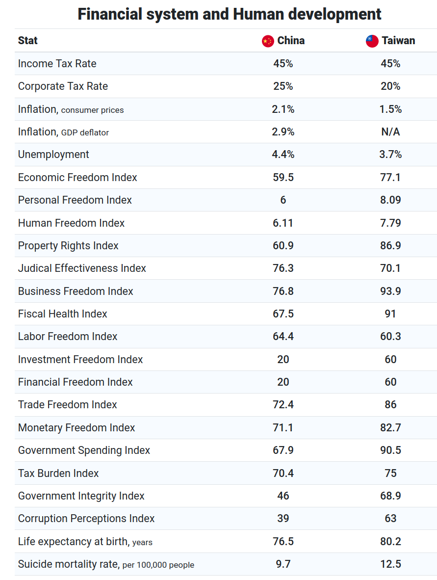 Je to taková všehochuť, ale jedna věc je jistá. Tchaj-wan zatím nespěchá do Číny a tady vidíte proč. V příjmech na hlavu a ve výše uvedených bodech ohledně demokracie jsou na tom mnohem lépe.