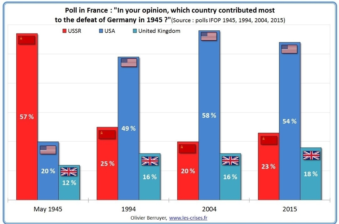 Lidé ve Francii, kteří zažili druhou světovou válku, připisovali vítězství SSSR, zatímco lidé, kteří o ní sledovali filmy, ho připisovali USA. Stejné je to v celé Evropě a samozřejmě i v USA. Vítězné kolo po druhé světové válce bylo ohromujícím propagandistickým převratem, který však nakonec připravil o rozum celou generaci amerických mozků. Další země Západu ZDE: Z historie se nepoučili.