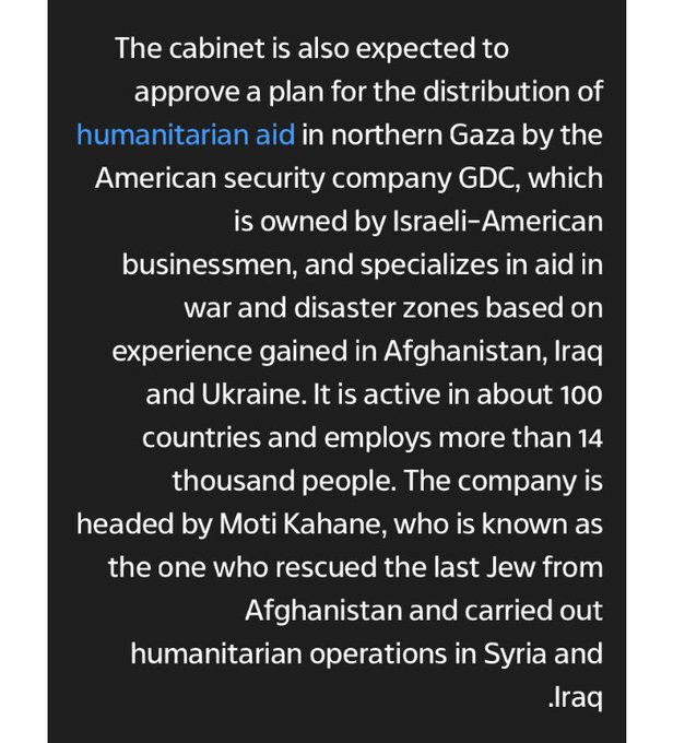 Dobrá zpráva má být, že uzavřené tábory v Gaze budou spravovány bývalými bojovníky v elitních jednotkách americké a britské armády a také kurdskými bojovníky. List Yedioth Ahronoth uvádí, že GDC se účastnilo různých válek podporovaných západem, včetně Afghánistánu, Iráku a Ukrajiny. Působí asi ve 100 zemích a zaměstnává více než 14 tisíc lidí. Společnost zaměstnává bývalé bojovníky v elitních jednotkách americké a britské armády a také kurdské bojovníky. Tito žoldnéři mají zajistit humanitární konvoje, které vstoupí do každé "bubliny." Společnost věří, že k "zajištění" každé "bubliny bude zapotřebí asi 100 žoldáků.” GDC začne fungovat do 30 dnů od okamžiku schválení a izraelská část společnosti bude pověřena koordinací činnosti s izraelskou armádou (ZDE)