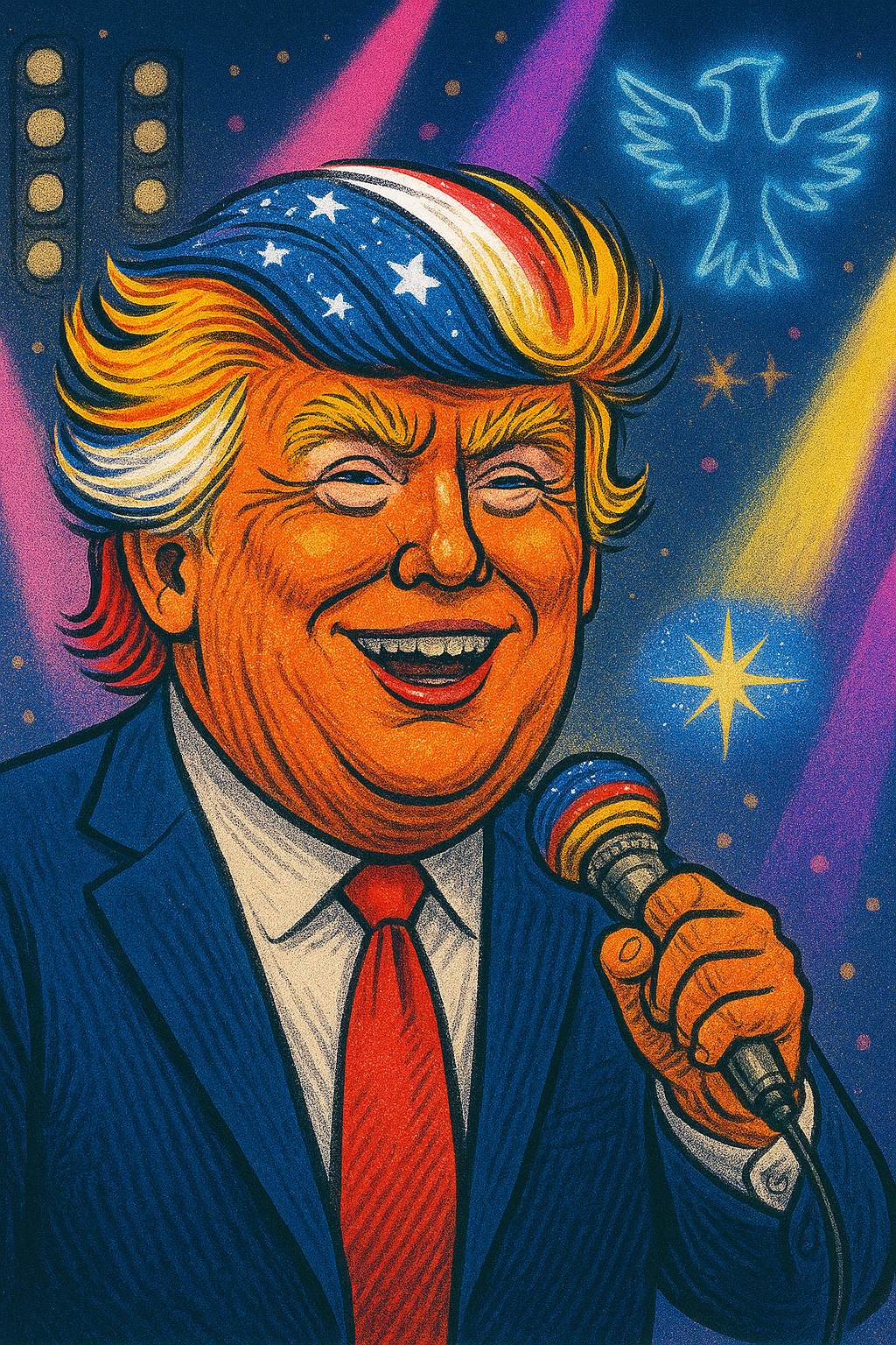 Trump vchází na jeviště — stadion v Helsinkách byl přebukován na zkoušku scénického míru. Eurovize sice ještě nezačala, ale Trump žádal generálku. Se vším: „Potřebuji vědět, jestli publikum přijme mír ve 4/4 taktu.“