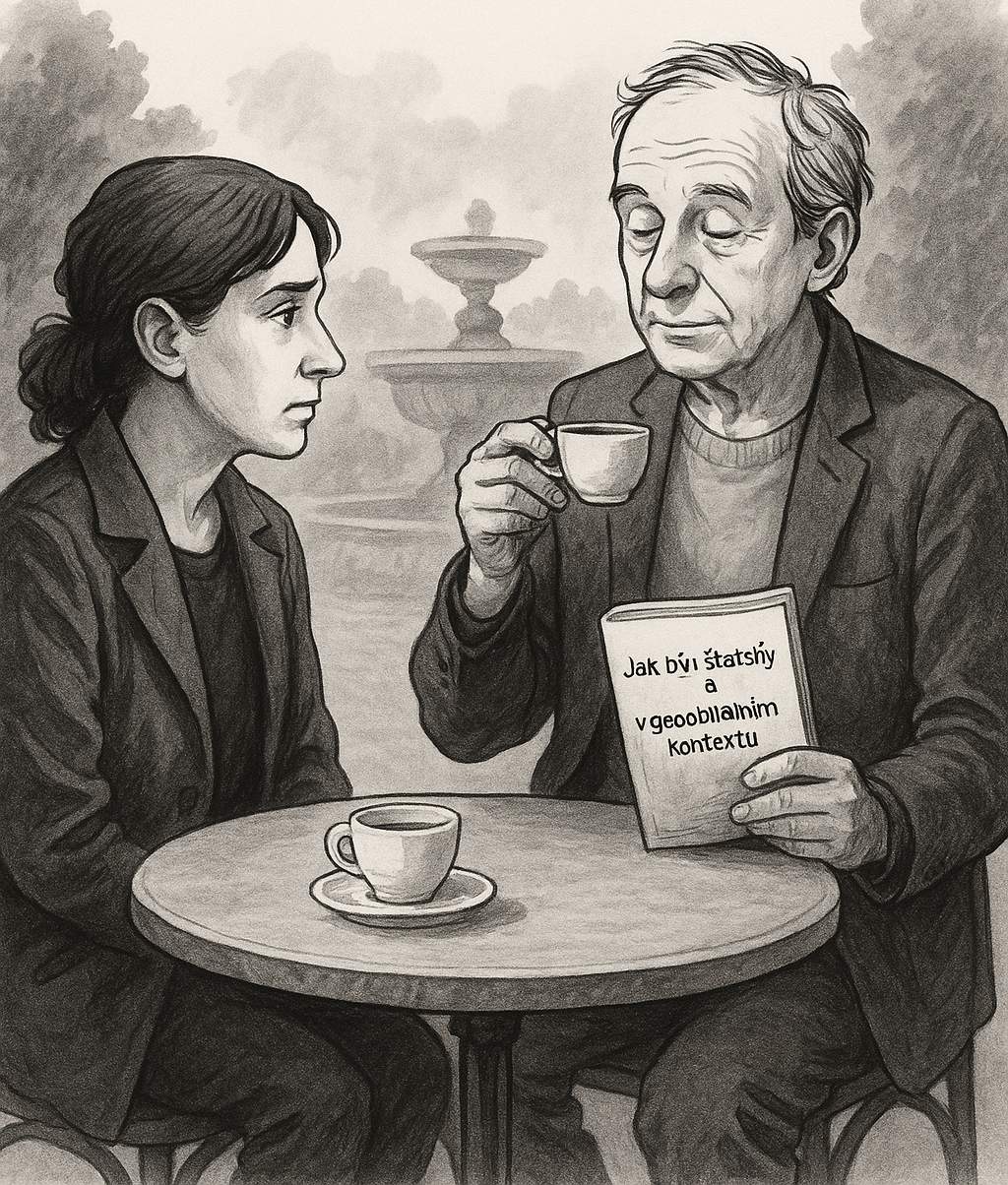 Yoscheková se vrátila do kavárny, kde to všechno začalo – espresso, papež, Josef Š. a sud s petrolejem. Josef seděl u stolku s výhledem na fontánu, která neproudila. Na klíně měl brožuru s nápisem „Jak být šťastný i v geopolitickém kontextu“ a vypadal nezvykle klidně. „Tak co, Jano,“ řekl, aniž by vzhlédl, „už jsi byla mezi těmi, co rozhodují o míru pomocí hologramu a cateringové tabulky?“
