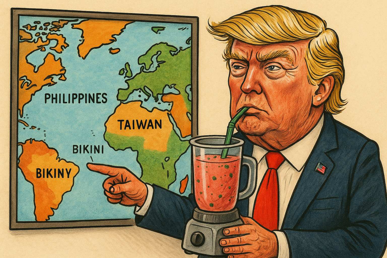 V záchvatu manické grandióznosti, jak ji nazývá jeho terapeut (který už třetí měsíc není k zastižení), Trump vrazí do pracovny a v pomačkaném pyžamu s výšivkou God bless me vykřikne: „ODVETA! SVOBODU TAIW… eh… FILIPÍNÁM! Ať čínská bota ví, že americká pěst umí i škrábat!“