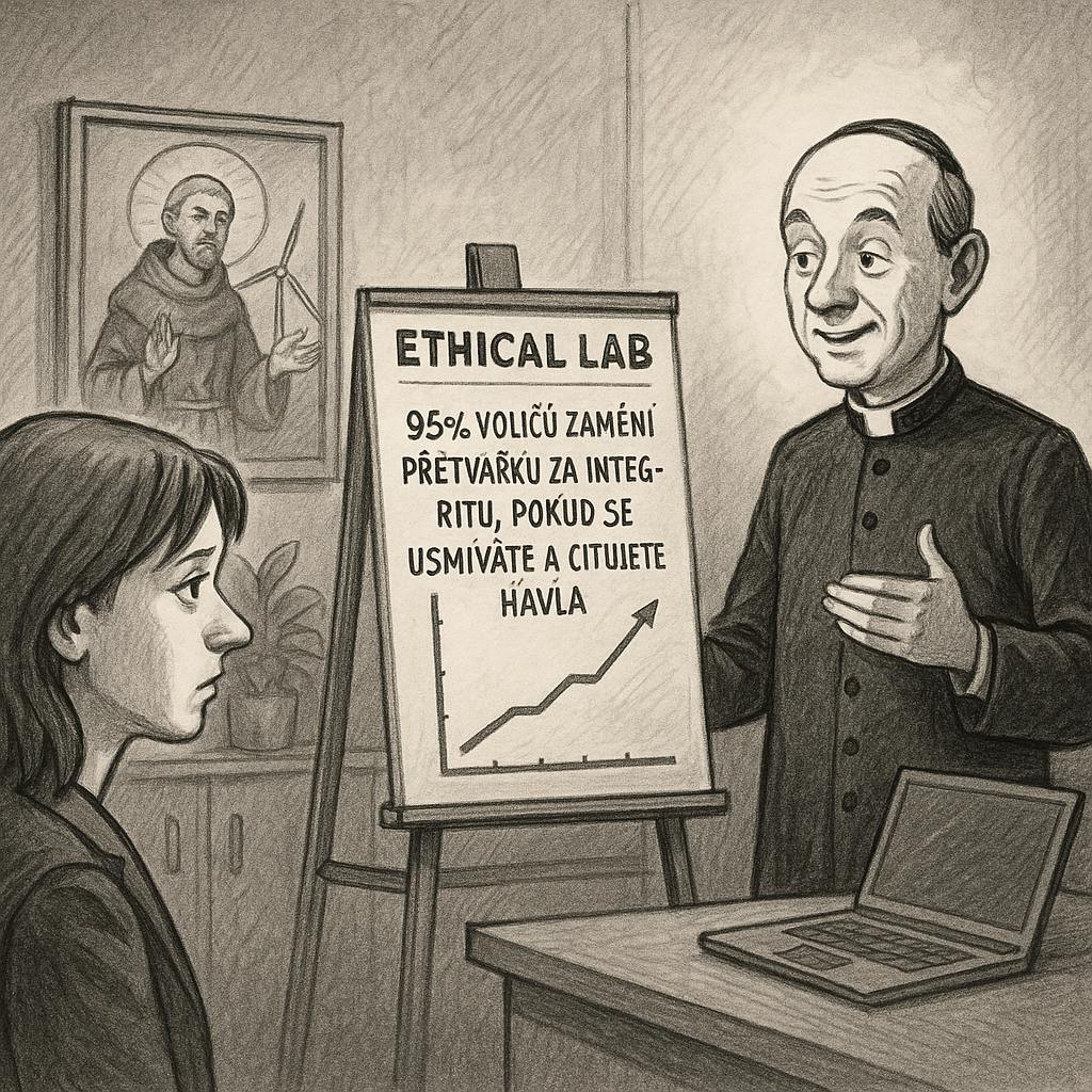 Yo byla vedena dál – skrz skleněné dveře se samoodemykáním (posvěcené firmou s koncesí 🏭𝕂🏭) do místnosti s nápisem „Etická laboratoř“. Uvnitř stál pater Ekonóm, muž s kolárkem z plastu a PowerPointovou prezentací místo breviáře. „Podívej, Yo,“ spustil, „tady děláme testy: jak moc může politik zalhat, než ho voliči začnou považovat za neautentického. Výsledky jsou velmi povzbudivé!“