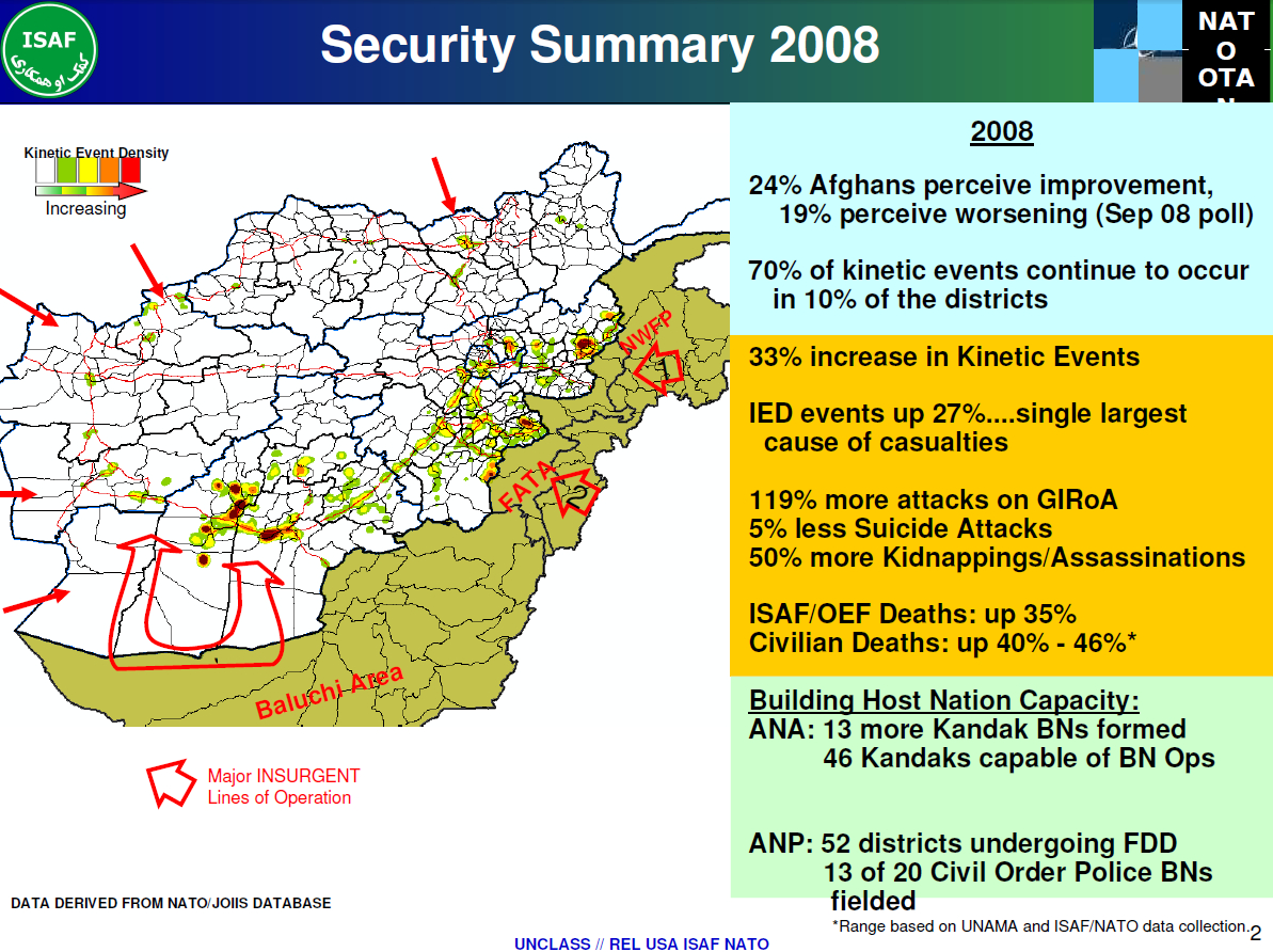 Nové vydání dokumentů na stránkách www.wikileaks.org se týká špinavé války v Afghánistánu vedené proti civilnímu obyvatelstvu. Podle interních dokumentů osvobozenecké či okupační armády (záleží na úhlu pohledu) se v roce 2008 zvýšil počet nevinných civilních obětí (včetně žen a dětí) o 46 %. Útoky povstalců na vládní objekty se dvojnásobily proti roku 2007 a stouply o 117 %. Celé armádní memorandum o situaci z roku 2008 si můžete stáhnout ze stránek Wikileaks. Kliknutím na obrázek se potvrzuje, že civilní oběti rostou jednak na straně sebevražedných atentátů a jednak na straně osvobozeneckých snah spojenců. Vybudování demokracie něco stojí.