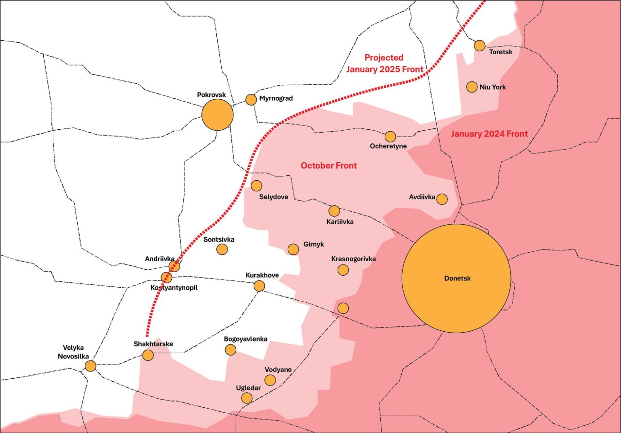 Západní a tedy proukrajinsky optimistické zdroje věří, že začátkem ledna se fronta dostane před Pokrovsk (dříve 25 tis. obyvatel). Pak se Doněck stane týlovým městem mimo dostřel běžných raket a začnou v něm konečně generální opravy infrastruktury ničené od roku 2014. Ale opevnění ukropů jsou proražena na velkém úseku fronty a nacisté z pluku Azov už mluví o mobilizaci dětí od 14 let. Takže to vypadá spíše na Berlín na jaře 1945. |