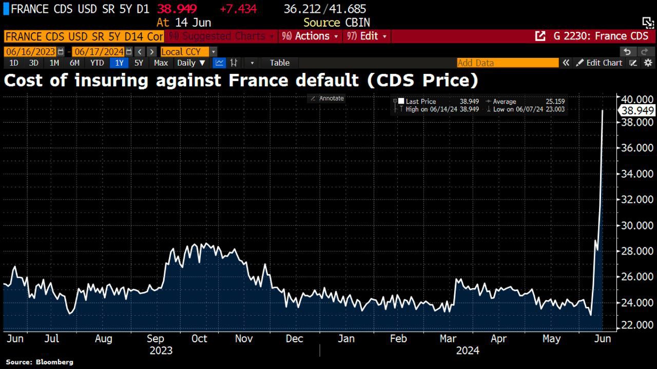 Sazba za pojištění francouzských státních dluhopisů po Macronově drobné invazi na Ukrajinu.