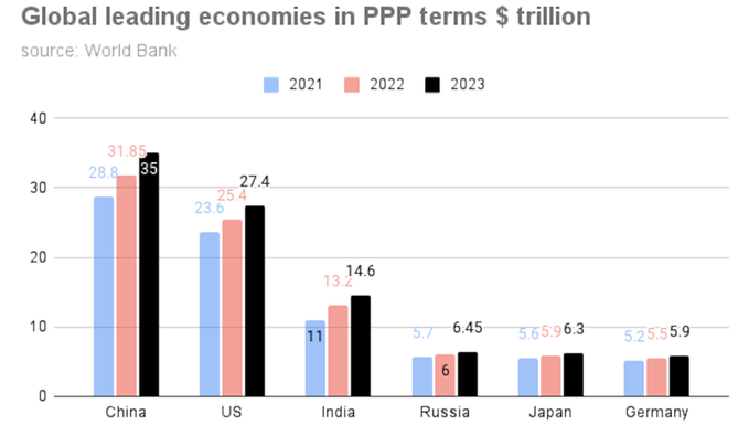 Porovnání je podle parity kupní síly (PPP), což naznačuje úspěšné oddělení od Západu. (x.com/Glenn_Diesen) |