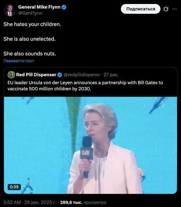 „Nenávidí vaše děti. Ani nebyla zvolena. A zdá se, že je šílená“. Tak komentoval bývalý poradce Donalda Trumpa Mike Flynn záměr Ursuly von der Leyenové očkovat do roku 2030 společně s Billem Gatesem 500 milionů dětí.