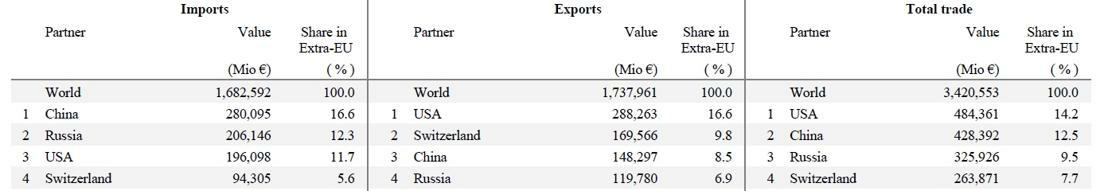 Vlastně říká totéž, ale v bledě modrém. EU má vůči Rusku trvalý deficit a ten dokonce kopíruje tabulku EU vývozu. Jinak řečeno: EU není schopno kompenzovat surovinové dovozy vyššími technologickými či potravinářskými vývozy do Ruska. A Rusko přitom dalo jako odpověď na sebepoškozující (čili hloupé) embargo EU do Ruska naopak velmi chytré embargo na zemědělské výrobky z EU, které do dvou let může do Ruska dovést každý. Tím tento segment dovozu z EU dlouhodobě zničilo, a tak pomohlo vlastnímu zemědělství. A na druhé kolo EU embarga zatím neodpovědělo, protože samo sebe poškozovat nebude, není tak hloupé jako EU. A nyní pojďme na hodnotu vzájemného obchodu v rámci celkové struktury dovozu a vývozu z EU.
