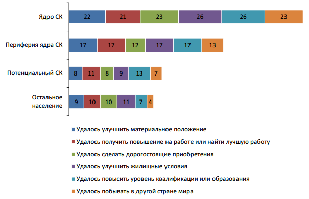 Pozitivní pohled na vývoj ekonomiky v roce 2003 byl pevný 34 % všech Rusů, a mezi jádrem ST se jejich počet rozrostl dokonce až na 50 %, o zhoršování ekonomické situace země se zmínili jen 7–8% zástupců ST. Stagnace životní úrovně za éry neoliberalismu a odtržení od hospodářského rozvoje bylo vnímáno jako "dočasné omezení". Mnozí vzdělaní zástupci ST se setkali se situací, kdy peníze nebylo vždy možné vydat za kvalitní služby. Zástupci ST ukazují vysokou úroveň reálného zapojení v síti sociální interakce a politické participace ve srovnání se zbytkem populace.