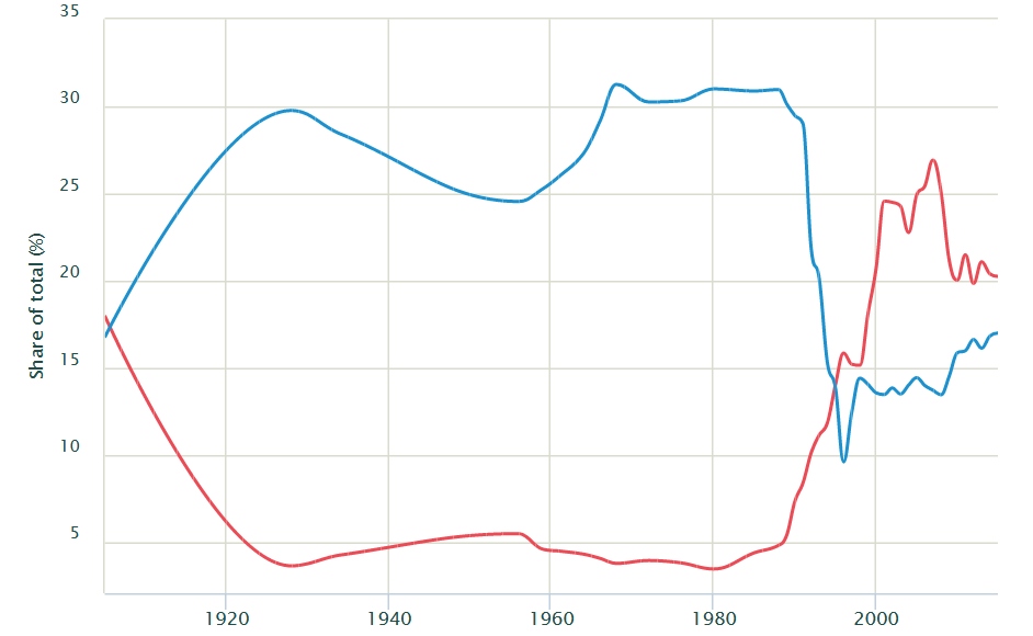 Červená pro jedno procento ukazuje raketový nárůst bohatství po divoké privatizaci státu na česko-ruský způsob. Stejně tak je děsivý propad modré, kdy pod dozorem amerických neoliberálů a bank došlo k prakticky kompletnímu ožebračení dolních 50 % obyvatel. Ale pozor, podívejte se na vládu Putina a na změnu v dynamice obou grafů. Modrá jde nahoru a červená naopak dolů. Současná vláda v Rusku zásadně změnila dynamiku rozkrádání státu pro jedno procento ve prospěch dolní poloviny, která bohatství jednoho procenta produkuje a nic z něj nemá. A to je také důvod srdečné nenávisti Putina a jeho systému na neoliberálním Západě. Globální západní korporace nesnáší ruský kapitalismus, v němž oligarchové musí platit alespoň nějaké daně a stát jim nepatří přes koupenou politickou elitu a přes koupenou byrokracii jako na Západě. Ale o tom bude řeč v pokračování o studené válce mezi Východem a Západem.