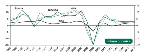 Všechny tři pobaltské země mají jeden společný jmenovatel, což je chorobná nenávist k Rusku. Jistěže je tato nenávist pochopitelná z hlediska obětí stalinismu. Také je pochopitelná z hlediska prohrané Druhé světové války a zmarněných životů v pobaltských divizích SS. Produktivním postojem by bylo zavedení demokracie, oživení kapitalistické ekonomiky a zahájení nové epochy dějinného vývoje. Tak se podívejme nejprve na to oživení ekonomiky. Statistika ukazuje procentový růst HDP všech tří pobaltských zemí ve srovnání s průměrem 15 EU-států.