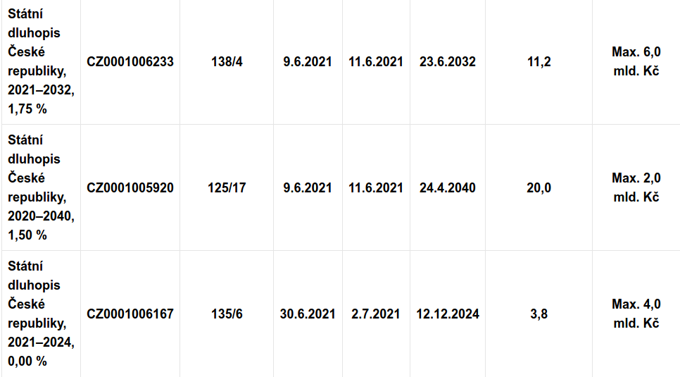 Takže jsme na 3 % a v USA je to oficiálně pět, což je podle mne mnohem realističtější odhad. A nyní se podívejte na poslední tranše dluhopisů, kterými se kryje deficit v rozpočtu. Jde o emisní kalendář střednědobých a dlouhodobých státních dluhopisů za červen 2021 a vybral jsem ty emise, které si nyní můžete koupit.