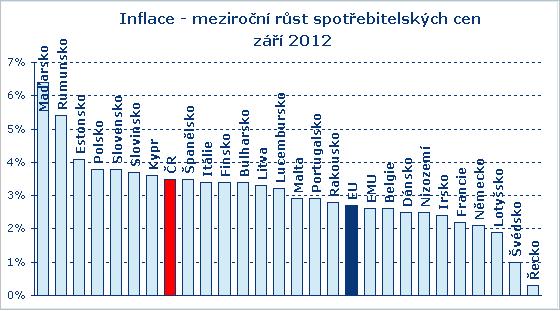 Zatím se podívejme na první náznaky důsledku kopírování americké politiky Fedu v podobě tzv."kvantitativního uvolňování" v eurozóně a nebo ještě lépe, v celé EU. Poněvadž import inflace v otevřené ekonomice je tak, či tak, nevyhnutelný. Proto by nás to, co provádí ECB, mělo zajímat. Ono se nás to také týká. Viz graf vývoje inflace: meziroční růst spotřebních cen v září 2012.
